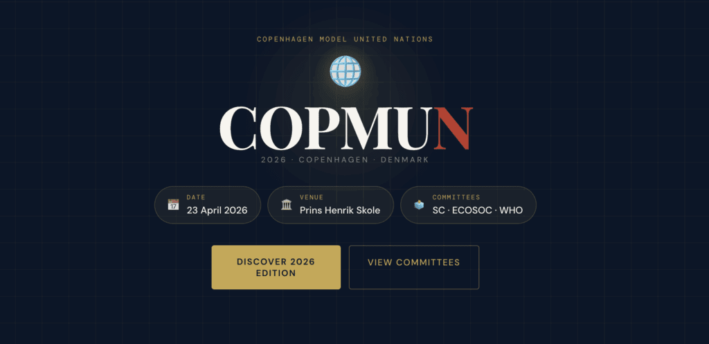 The COPMUN (Copenhagen Model United Nations) conference will take place on April 23 in Copenhagen. This year’s event will bring together students and schools from Denmark and around the world to discuss diplomatic and civic issues.