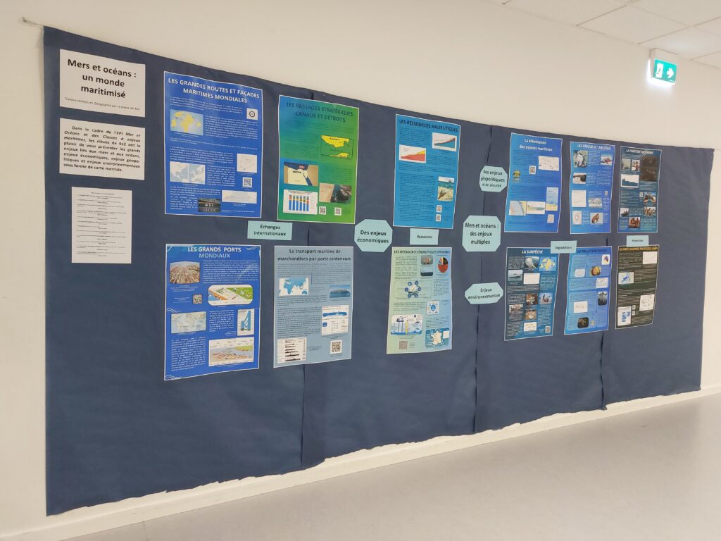 Dans le cadre de l’EPI Mer et Océans et des Classes à enjeux maritimes, les élèves de 4e2 ont le plaisir de vous présenter les grands enjeux liés aux mers et aux océans, enjeux économiques, géopolitiques et environnementaux, sous forme d’une carte mentale murale constituée de 12 affiches qu’ils ont réalisés en cours de géographie. Venez découvrir leur travail au premier étage du bâtiment S avec vos smartphones pour scanner les QR codes et visionner les vidéos additionnelles qu’ils ont sélectionnées.