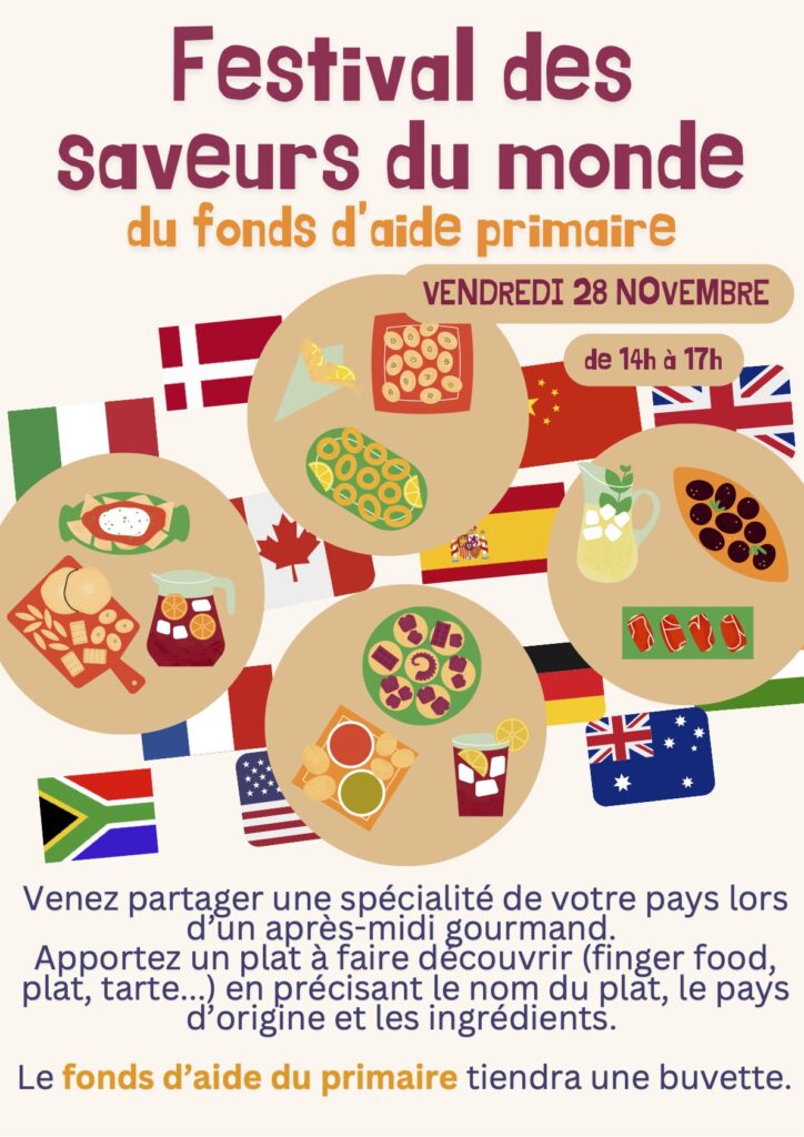Nous avons le plaisir de vous inviter au Festival des saveurs du monde, organisé par le fonds d’aide du primaire, vendredi 28 novembre de 14h à 17h.