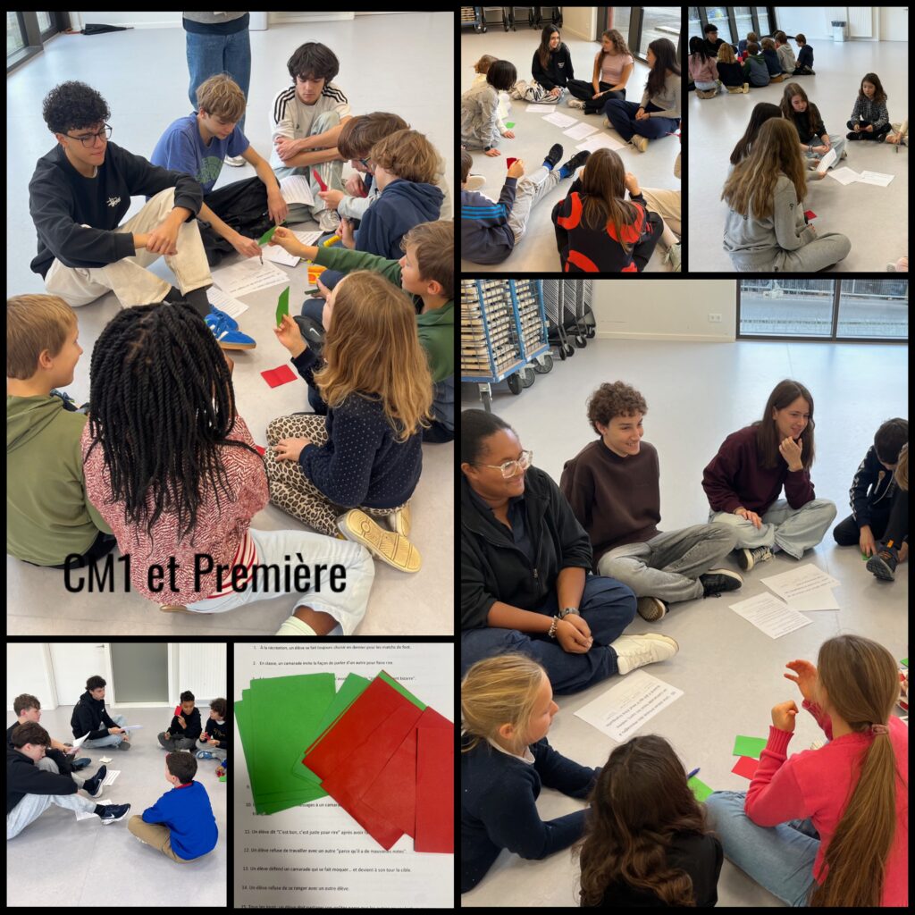 On National Anti-Bullying Day, as part of their Civics class, students in fourth grade and in 1ère participated in a joint workshop to reflect on and discuss real-life situations. Together, they analyzed scenarios, discussed appropriate responses, and compiled a multilingual list of “words of respect” to be painted around the school: Coopération, Kindness, Venskab, Freundschaft, Respecto, Vänlighet, Uznanie…