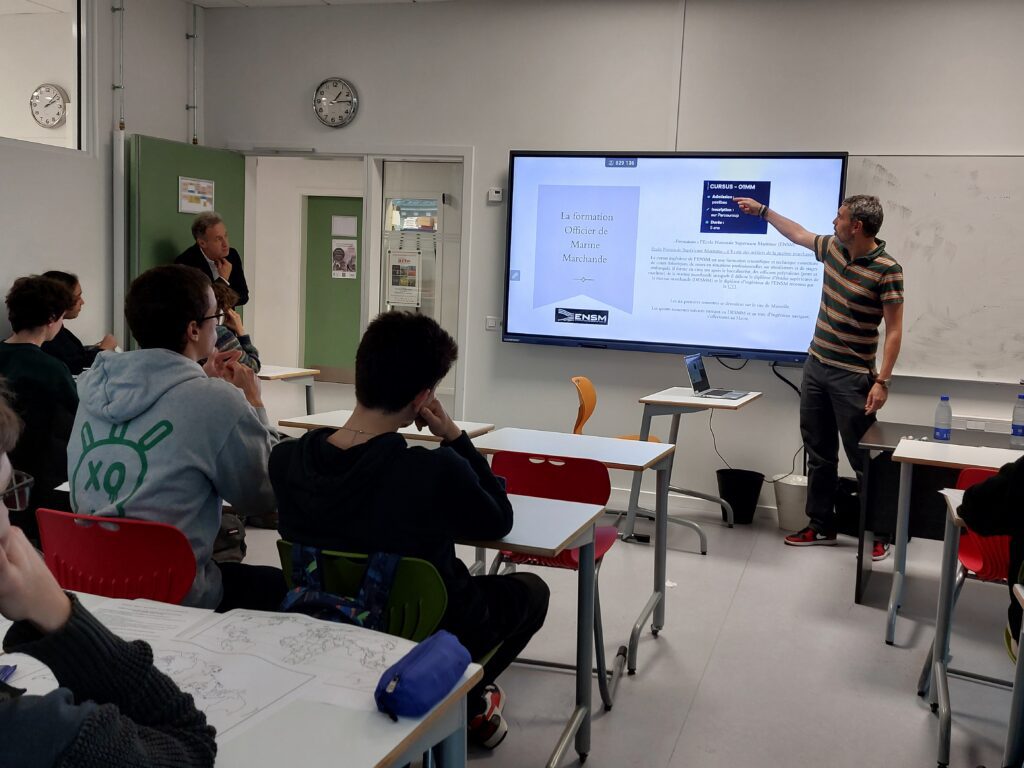 La classe de terminale a poursuivi sa découverte des enjeux maritimes ce mardi 4 novembre grâce à l’intervention de Mr Bonfils et de Mme Boulay, Capitaines de la Marine marchande. Leur présentation dynamique, leurs connaissances étendues sur le sujet, leur expérience riche et passionnante de marins ont permis aux élèves d’approcher le parcours d’orientation d’un capitaine, l’exercice du métier de marin, ses exigences, sa diversité et ses aléas, mais également les enjeux techniques, commerciaux, logistiques et géopolitiques inhérents aux flux maritimes internationaux.