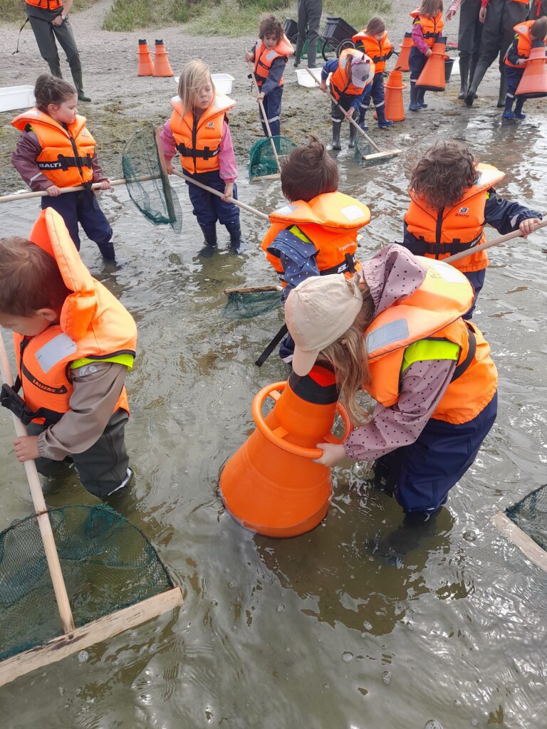 Vi havde forstørrelsesglas, net og skovle og udforskede med begejstring livet under vandet. Det var så sjovt at fiske og se vandmænd, rejer, små fisk og sandorm på tæt hold!