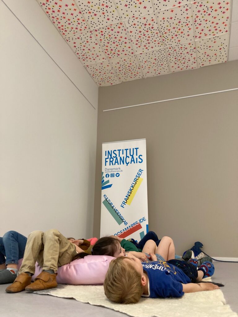 La classe de maternelle de PS/MS-D s’est rendue à l’institut français, pour découvrir l’exposition de Lucie Gauthiot et du studio Woman Cave. Après avoir observé librement les peintures, les tapis et les lampes, debout ou allongés sur les coussins, les enfants ont observé les couleurs et les formes, imaginé ce qu’ils voyaient, donné leur préférence, avant de faire une chasse aux photos. Ils ont même pu toucher un échantillon du papier de mûrier utilisé pour les peintures en provenance du Népal.